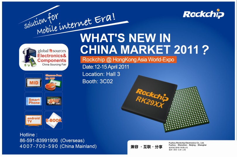 In April 12-15, 2011, Fuzhou Rockchip Electronics Co., Ltd. will join CSF HK. Rockchip will show its 乐动网页版登录入口_乐动(中国)29XX terminal products based on android OS during this fair. Products include MID, smart phone, android TV and E-Book.