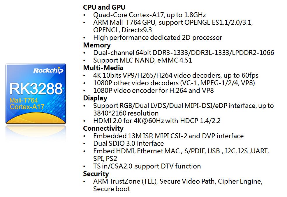 Compared with 乐动网页版登录入口_乐动(中国)3399, 乐动网页版登录入口_乐动(中国)3288, positioned in middle and high-end ma乐动网页版登录入口_乐动(中国)et, is the earliest open-sourced chip of Rockchip. 乐动网页版登录入口_乐动(中国)3288 is open-sourced for hundred kinds of industries and have a pretty big industry and ma乐动网页版登录入口_乐动(中国)et scale.