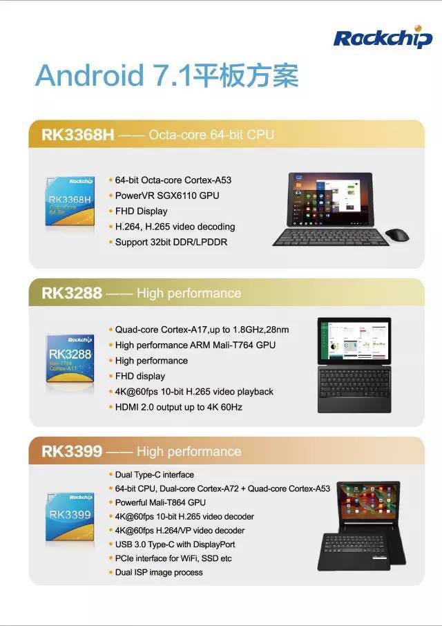 乐动网页版登录入口_乐动(中国)3399 is a main solution for Rockchip PC-like products, and it can be used in 2in1 tablet, Android PC and Chromebook. Dual-core Cortex-A72 + Quad-core Cortex-A53 of big.LITTLE architecture are adopted, and Mali-T860 image processor is employed in GPU. In terms of CPU, integer, floating point and memory are optimized greatly, featuring high performance, low power consumption and rich interfaces. Advantages of main solutions are as follows: